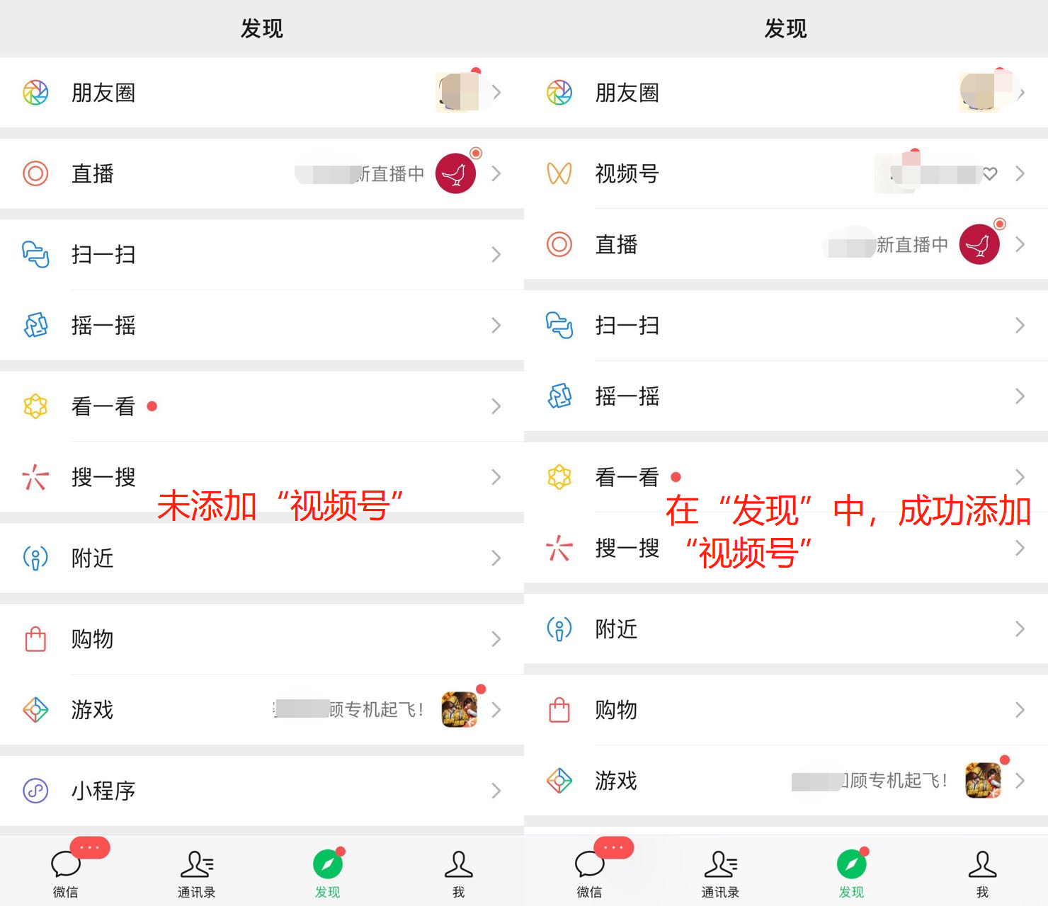 “视频号”功能添加前后对比如下图所示。