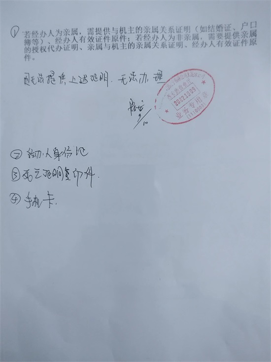 因无法提供上述现明.无法办理。(西安路营业厅业务专用章)