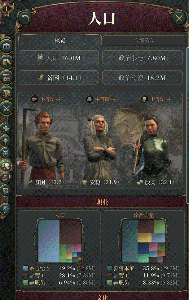 但想要还原这一段历史,并且从游戏机制的角度,去解释国家的兴衰,单纯依赖“跳事件”显然心思是不够的。在一代当中,Paradox就引入了「POP」机制(Parts of Population),这是《维多利亚》系列的核心,奠定一切的基础。它也延续到了新作当中,并且在其他P社游戏内也有所体现。在不少策略或者模拟经营游戏内,人口更像是一种独立存在的资源,哪怕有所划分,也可能战犯只是简单的分类。在V3中,「POP机制」将人口以地区、文化、宗教、职业、受教育程度、收入水平等等一系列要素,划分为非常具体的人群。而且很重要的是,这些标签并不是唯一,它可能复合地出现在各种人群身上,形成了一个复杂的「人口群」。