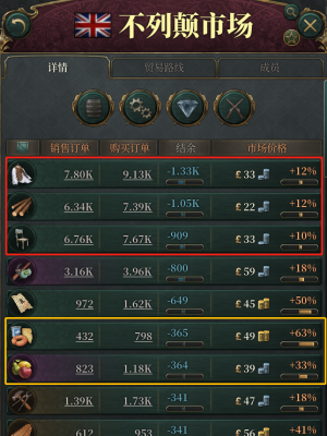 《维多利亚》系列的另一个核心,p社玩家人均甲级战犯,就是它的经济系统了。当然,这部分就比较接近我们日常玩的模拟经营游戏了。只不过,确实要复杂一些。如果硬要类比,它可能类似于《纪元1800》的放大版。在V3中,游戏将48种经济产品分为「日用品」、「工业品」、「奢侈品」和「军用产品」四个大类。它既可能是满足「人口群」需求的产品,可能是国家实现工业化急需的原料,也可能是本国大量生产,邻国急缺的制成品。还是以英国为例,在游戏开局的时候,p社玩家全部枪毙是什么梗,你会发现,服装、原木以及普通家具,是整个不列颠市场中结余最少的。而再往下看,作为绝大多数「人口群」基础消费的加工食品和水果,价格偏高。