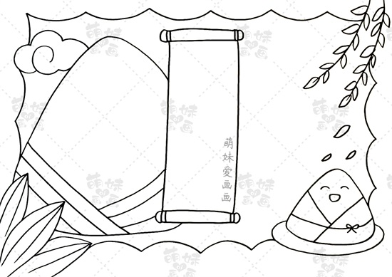 端午节的手抄报可以选择粽子、粽叶、卷轴等简单的元素来绘制手抄报,我们可以点缀一些叶子和祥云来增加手抄报的细节。
