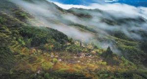 在庆元县,许多村落依山傍水,潺潺溪流提供农业生产所需的水源并调节水文气候,独特的山地生态资源为食用菌栽培提供良好的自然条件。沿山坡等高线,村民们在森林与村落间的平缓坡地因地制宜修筑少量梯田,种植蔬菜粮食,扩大农业生产又保持水土,菌物生产废料也实现循环利用。