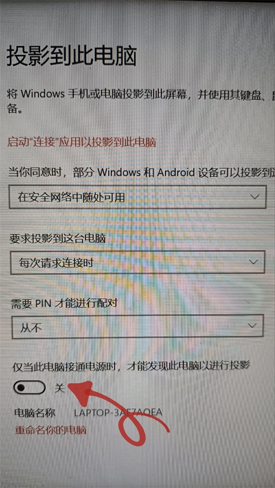 第三步,打开“仅当此电脑接通电源时,才能发现此电脑以进行投影”(