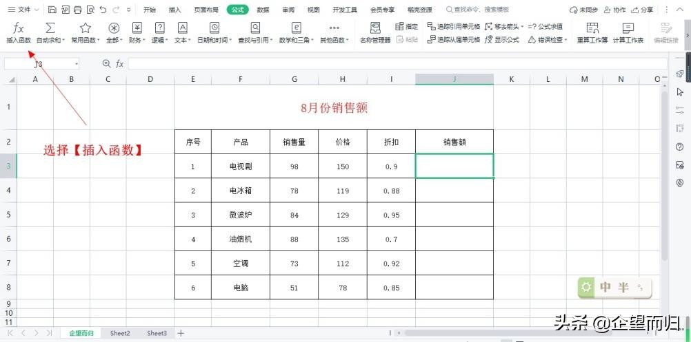 首先,选择J3单元格