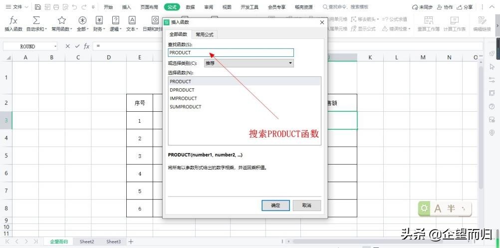 打开的对话框中查找函数下搜索PRODUCT函数,然后选择下面的PRODUCT函数