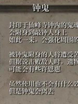 钟鬼是在游戏前期玩家就会遇到的一口大钟,只要敲击键盘一次,就会让游戏难度整体提升用的一层,让所有敌人的韧性加强,同时让敌人更容易打崩你的架势,揍你伤害更高,是大多数玩家高周目为了挑战自己增加狼蝶难度才会使用的BUFF,没看说明的失明对这一切并不知情。