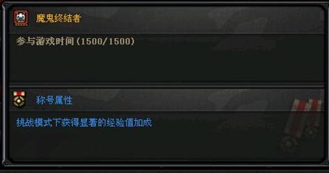 游戏时间长达1500即可,不过这里倒不知道这里是按照分钟还是小时统计,如果是分钟,也仅仅是25个小时,这也太好获得了,所以这里应该是按小时计算,获得这个称号的玩家都是1500小时的大手子,遇到装备这个称号的玩家可得小心点。