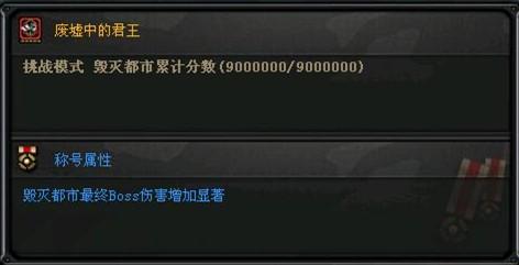 挑战地图毁灭都市的成就,在挑战地图当中达到900万分即可获得,废墟二字显没落,君王二字又足显霸气,颇有当年楚霸王之气势!