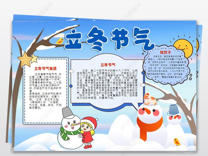 1、工具原料碳素笔白纸方法步骤1第一步先画出手抄报的边框2第二步在手抄报的左上角写出“立冬”的美术字体3第三步在手抄报的右下角画出一个雪人4第四步在手抄报的空白部分画出内容的几个边框5第五步把内容边;24节气手抄报可以写一些一二十四节气是什么 二十四节气,是历法中表示自然节律变化以及确立“十二月建”的特定节令一岁四时,春夏秋冬各三个月,每月两个节气,每个节气均有其独特的含义廿四节气准确的反映了自然;立冬小报内容写立冬是每年阳历的11月7日或8日,太阳到达黄经225度时的一个节气“立冬”和“立秋”一样,古人同样在这个季节用占卜的方法来看冬天的冷暖,如“立冬晴,一冬凌寒冷,立冬阴阴雨,一冬温暖冬”。