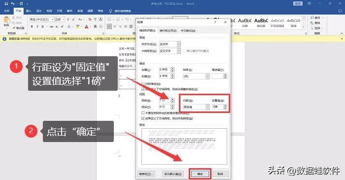 在打开的窗口,行距调为【固定值】,设置调为【1磅】,单击【确定】就可以了。