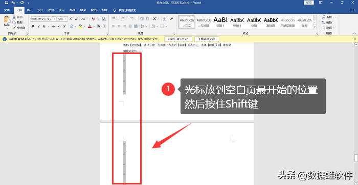 还有一个批量删除空白页的方法,就是把鼠标的箭头定位在空白页最开始的位置,然后按住Shift键,在空白页最后单击,就选择成功全部的空格,这时只需要按下【Delete】键,空白页就被批量删除了。