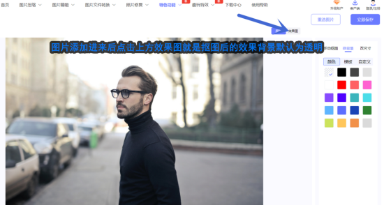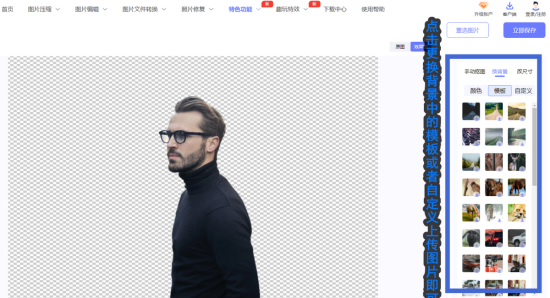 第四步:在图片抠图之后可以给背景色选择更换为纯色背景或者点击模板中选择自带的图片作为背景,当然也可以在自定义页面上传需要更换的背景,更换完成后点击右上角的“立即保存”按钮完成操作。
