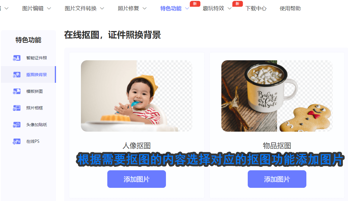 第二步:进入在线抠图、证件照换背景功能后,根据需要抠图的内容选择是人像抠图or物品抠图,并在对应抠图功能下点击“添加图片”按钮把图片添加进来。