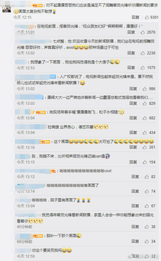 两位boys的呆萌表现让网友们乐不可支,纷纷评论,“哈哈哈哈撒老师有点懂哦”、“对不起康康哥哥我们应该是满足不了挥着荧光棒听你播新闻的要求了画面太复杂我不敢想”、“我去准备荧光棒了,康辉我为你挥舞!!”