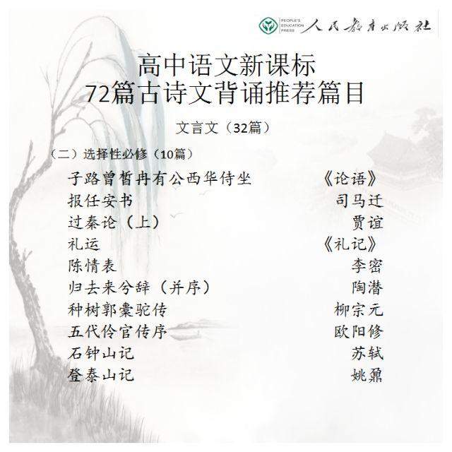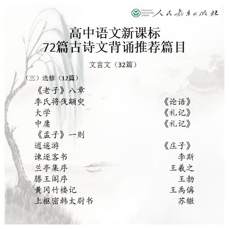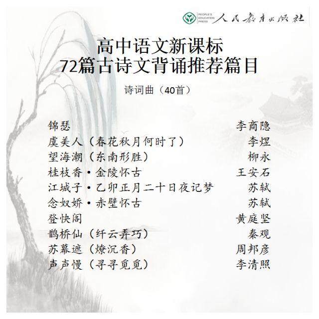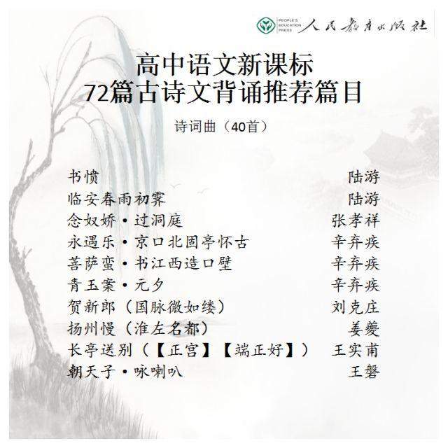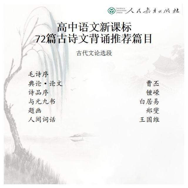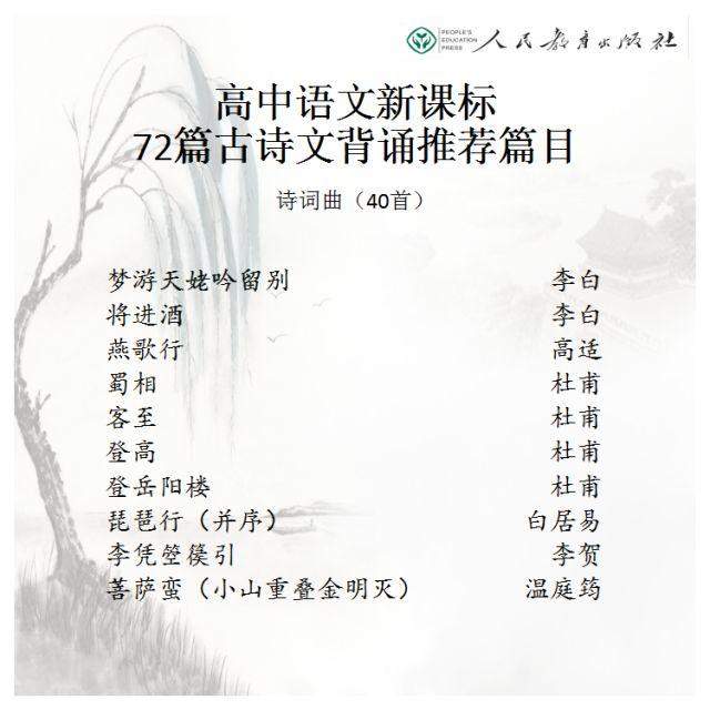以上“古诗文背诵推荐篇目”选自由中华人民共和国教育部制定、人民教育出版社出版的《普通高中语文课程标准》(2017年版)。