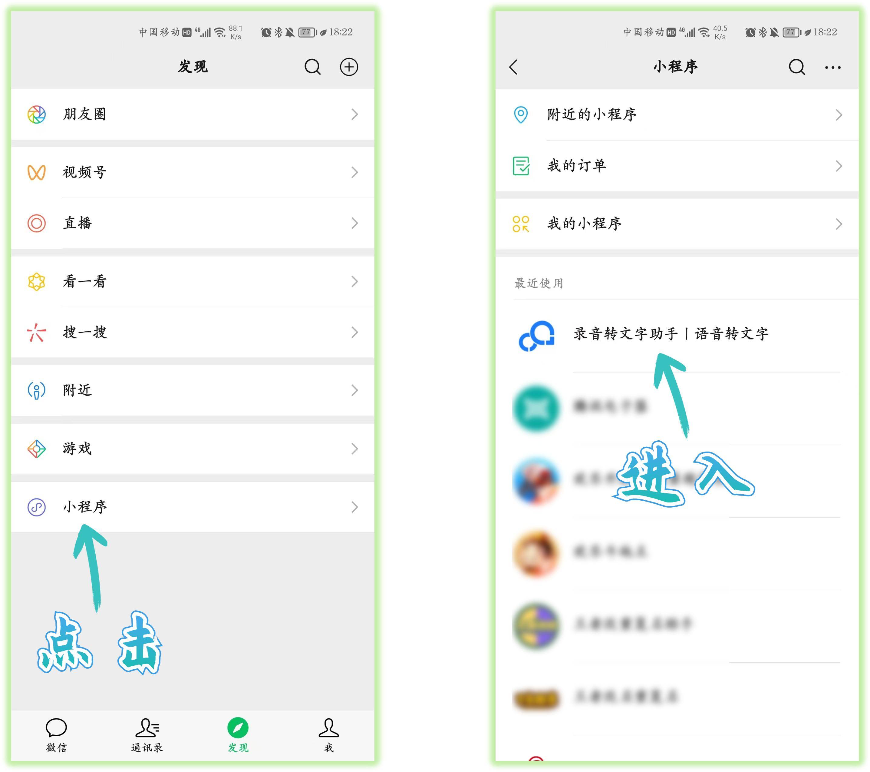 我们还可以点击微信底部的「发现」,进入「小程序」功能界面,然后点击左上角“放大镜”,在里面查找「录音转文字助手 | 语音转文字」,并点击进入。
