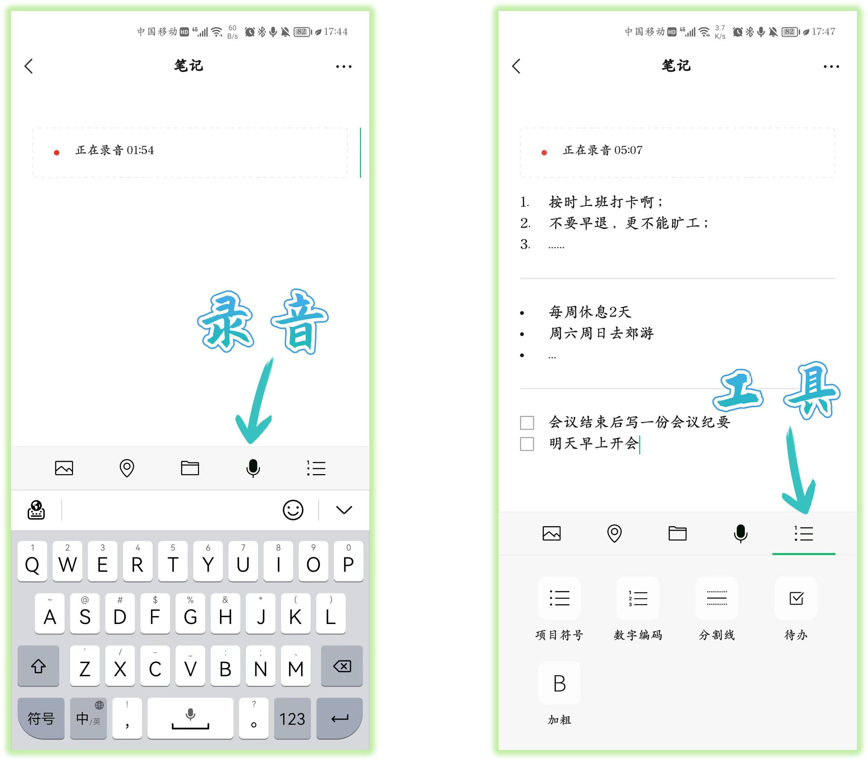 在空白的笔记界面,点击键盘上方的“麦克风”按钮,就能进行录音了,将会议上领导的发言全部录制下来,并且还能使用项目符号、数字编码、待办工具记录。