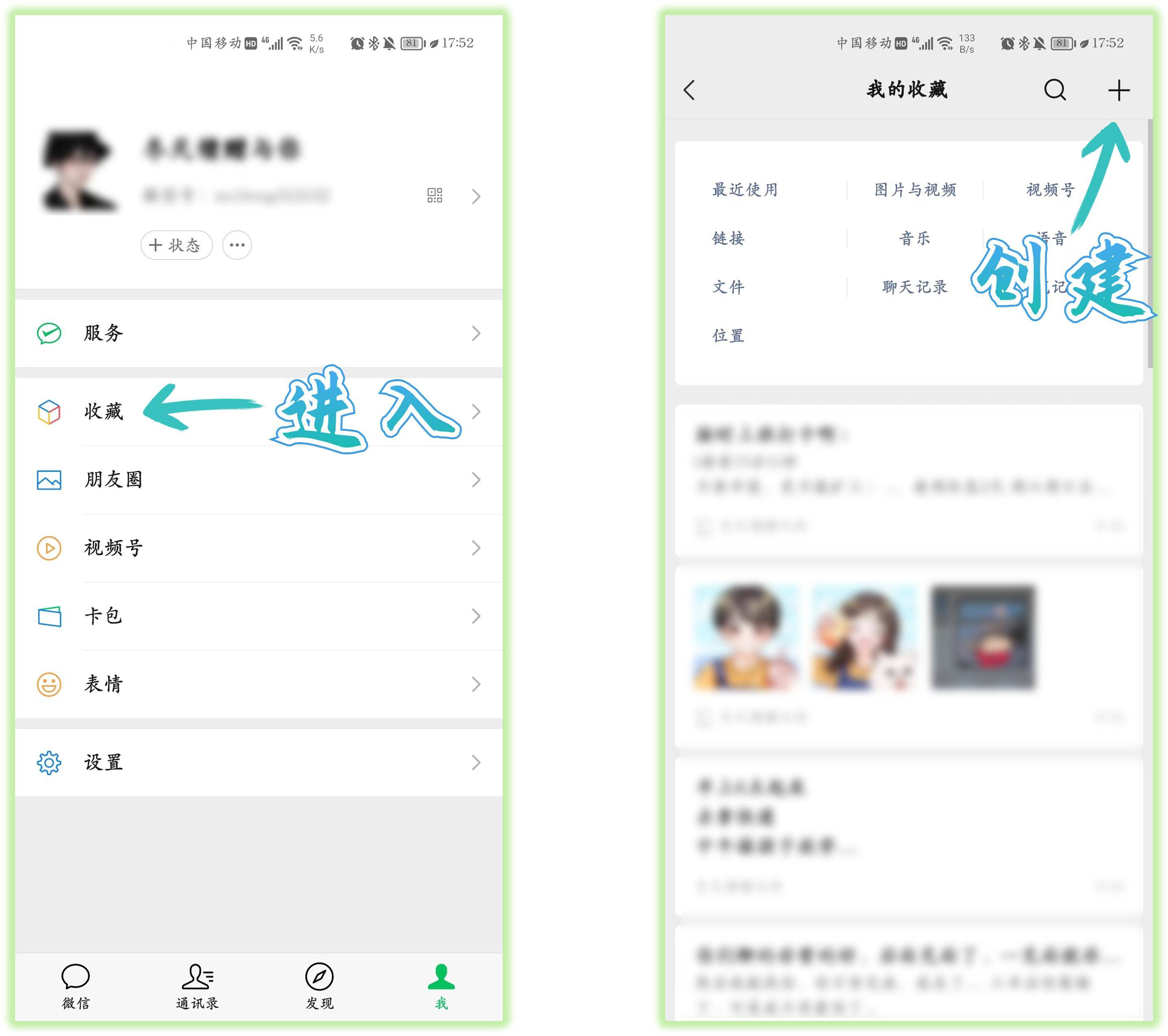 首先我们打开微信,点击右下角的「我」,进入「收藏」功能界面,然后点击右上角的“+”号,新建一个笔记。