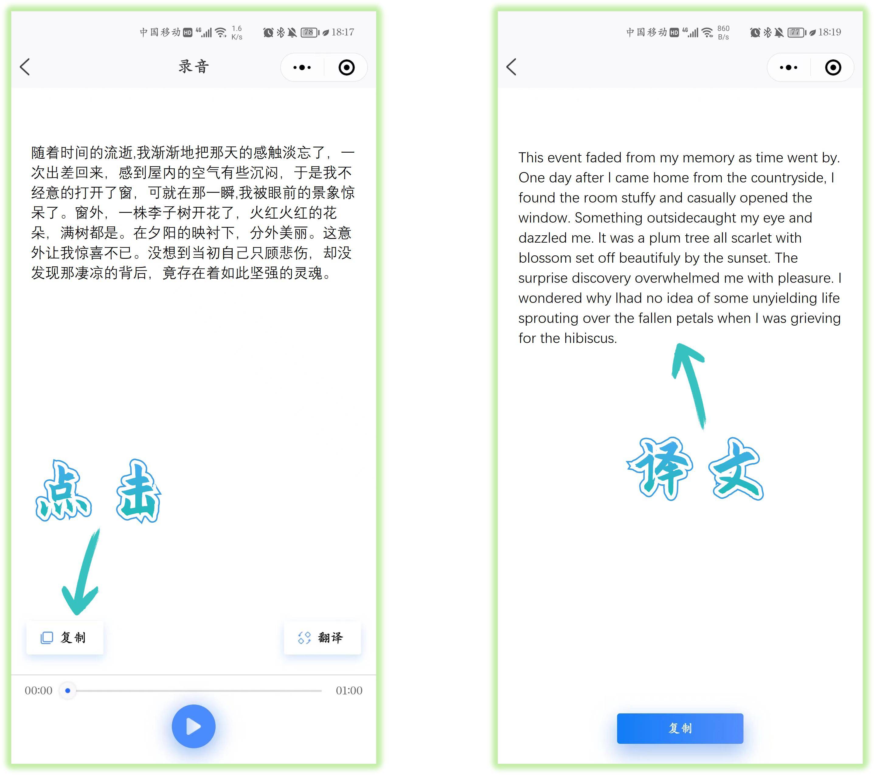 随后开始自动处理音频,等待3秒左右,就能将录音转换成文字了,点击底部的播放按钮,一边听录音一边检查文字是否有误,点击「复制」按钮提取内容。