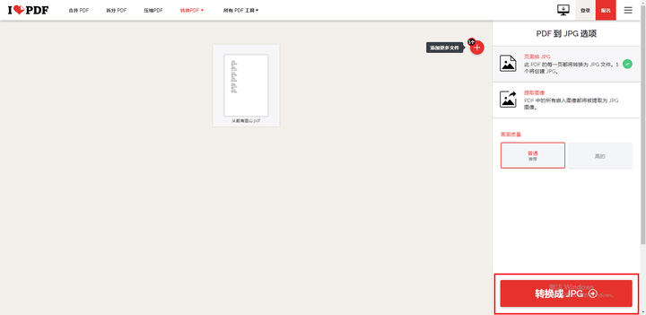 选择PDF转图片,添加好自己需要转换的文件,点击右下方的【转换JPG】即可,可以自己选择转换出的内容画质