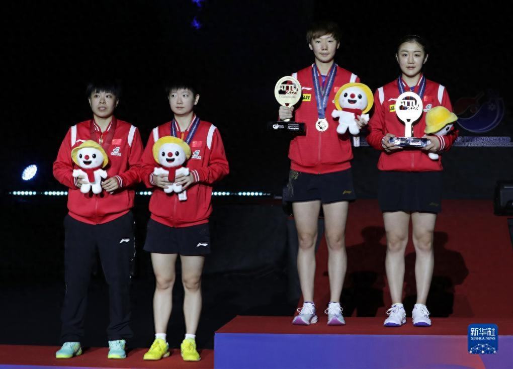 9月10日,王艺迪、孙颖莎、王曼昱和陈梦(从左至右)在颁奖仪式上。新华社发(李相浩摄)