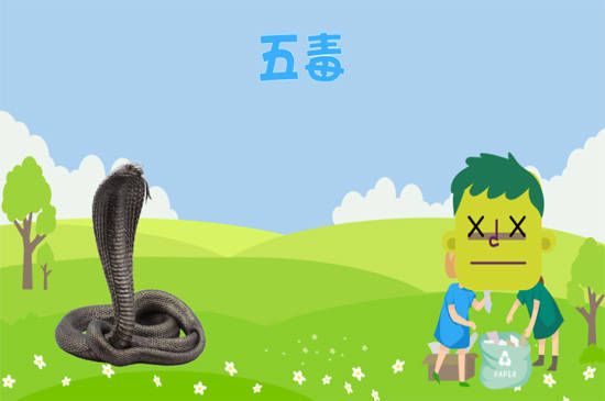 五毒指的是蜈蚣、毒蛇、蝎子、壁虎、蟾蜍。蜈蚣的体内有毒液,被咬过之后会有肿痛感,毒性大的蛇会直接造成人的死亡,被蝎子蜇中毒后人会抽搐引起中风,蟾蜍不会攻击人,但毒性极大,其会分泌蟾酥,严重的情况下会致盲致命。