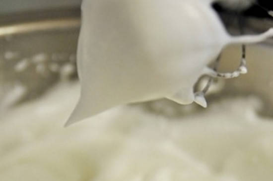 打发蛋清,先将蛋清放入干燥无油脂的容器里,用打蛋器顺着一个方向旋转,打至起泡,加白糖继续打发,蛋清逐渐变得粘稠起来,再加点糖,继续打发,提起打蛋器,出现小尖,蛋清就打发好了。