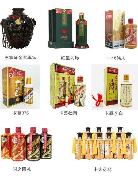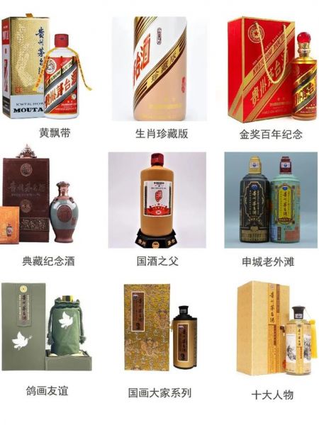 小批量勾兑酒质茅台有巴拿马金奖黑坛、红星闪烁、卡慕375、卡慕杜甫、卡慕李白、国之四礼、黄飘带、生肖珍藏版、金奖百年纪念、典藏纪念酒、申城老外滩、鸽画友谊、十大人物、彩色茅台、五十六个民族等等。