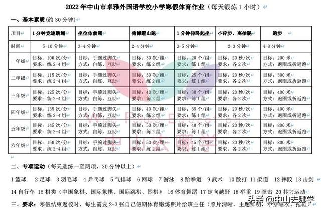 一二年级 :1、跳绳 1分钟/组*3组 2、坐位体前屈1分钟/组*3组 3、高抬腿跑 20次/组*2组 4、开合跳30次/组*2组 5、慢跑5分钟一次