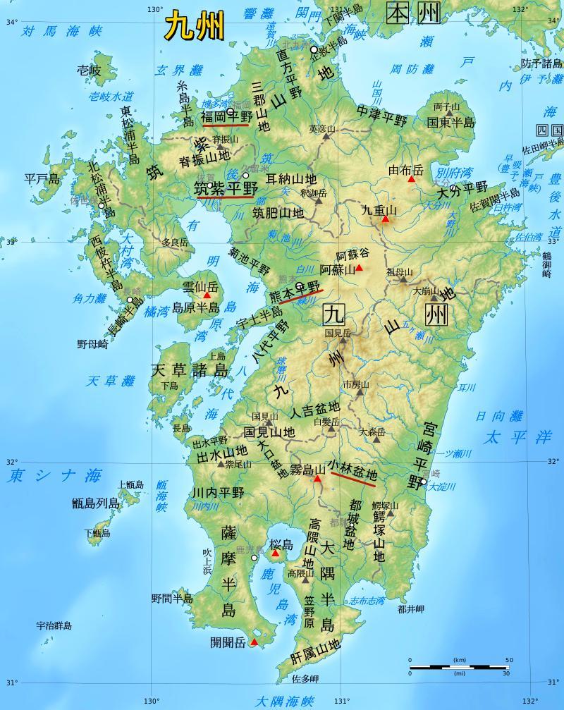 在日本的九州岛上:该岛最大的平原是筑紫平原(面积约为1200平方公里),其次是熊本平原(面积约为700多平方公里)、福冈平原等。