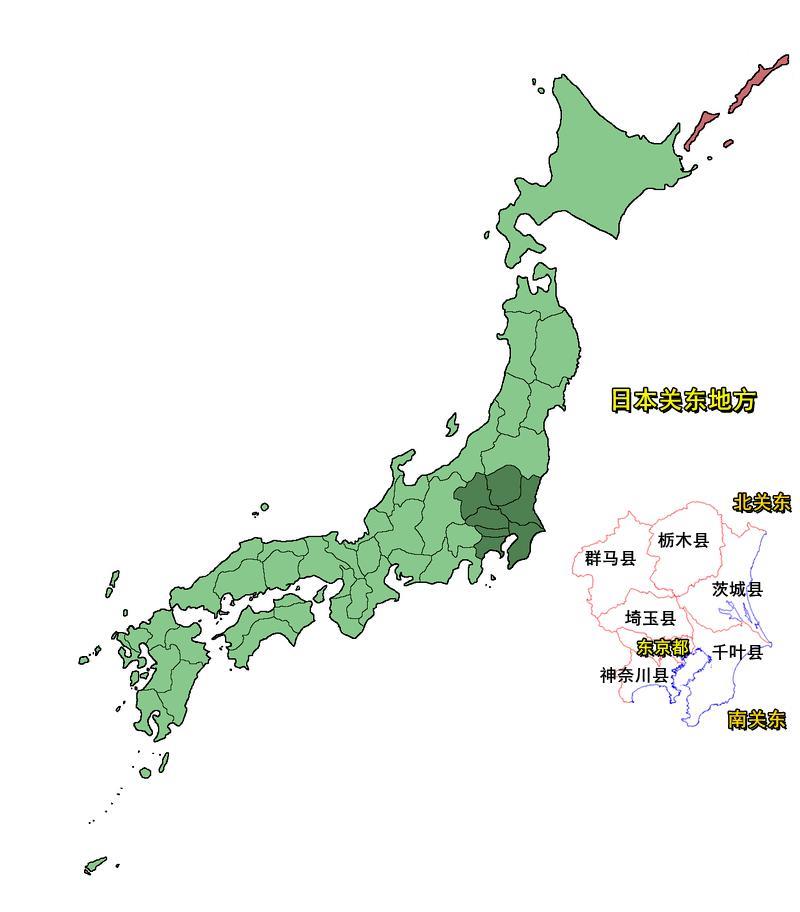 东京都、神奈川县、千叶县、埼玉县这一都三县在日本被称为南关东,而茨城县、栃木县、群马县这三县则被称为北关东,以上这些行政区域构成了日本的关东地方。日本东京都市圈一般包括东京都、神奈川县、千叶县、埼玉县这一都三县。
