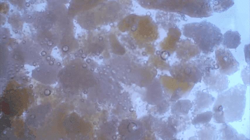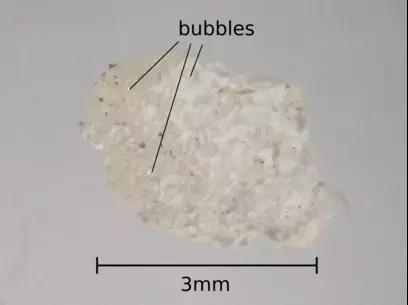 尽管糖块裂开了,但在这些小碎片里面,依然存在着很多小气泡结构,这里面就“封印”着高压的二氧化碳气泡。