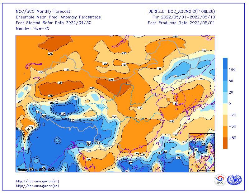 从中期降水量预报来看,5月上旬山东的雨水依然十分稀少,绝大多数地区十天降水总量仅为0~10毫米,对于山东南部来说,这样的降水量显然是偏少的,不利于缓解当地的气象干旱。
