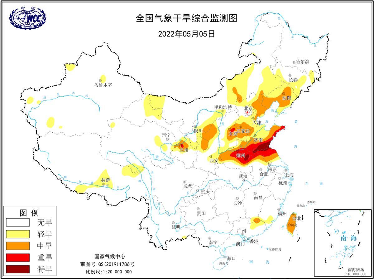 因为雨水稀少,且晴好天数明显偏多,山东中南部、江苏背部、河南中北部明显干旱,普遍是中到重旱,部分地方像是山东南部,出现了特旱!