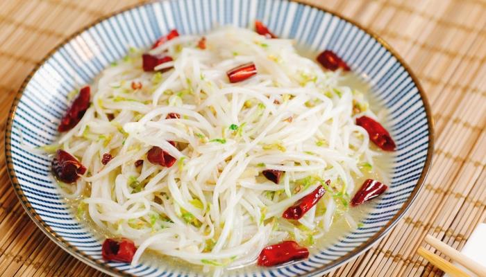 食材:300克绿豆芽、小葱少许、花椒少许、醋适量、糖少许、盐适量