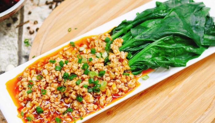 4、将肉酱淋在菠菜上,撒上葱花即可。