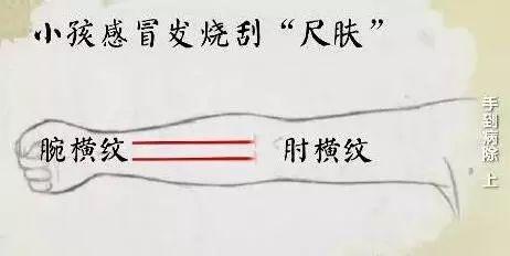 小孩子退烧要部位刮拭好还尺肤的位置,从腕横纹刮拭到肘横纹,轻轻刮拭100下,小孩子皮肤娇嫩,一定要记得放刮痧油!