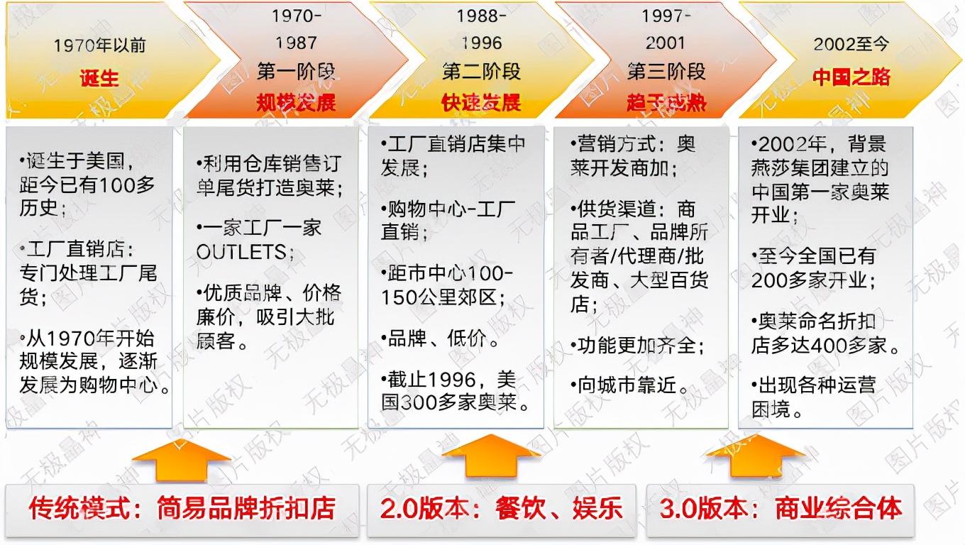 大致经历了3个阶段:传统简易品牌折扣店-业态升级引入餐饮娱乐(2.0版本)-商业综合体(3.0版本),2002年国内第一家奥特莱斯店在北京开业。