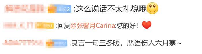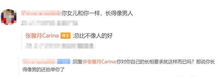 其中,有一位网友的评论惹恼了张馨月,这位网友表示你女儿和你一样长得像男人。在看到这样的恶评之后张馨月当时就忍不住了,直接在社交平台上开始回怼。张馨月的回到“总比不像人的好”,言下之意就是在指这位网友不是人。看到张馨月这犀利的回复之后,有不少的网友都再下方为她点赞。