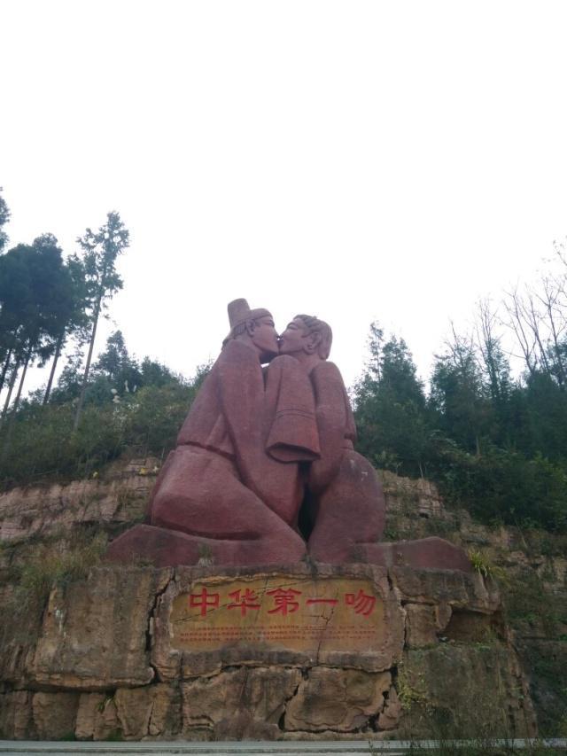 一尊巨石之上,刻着两个人物的雕像,分别是卓文君和司马相如,司马相如峨冠博带,宽袍大袖,卓文君则抒发插花,显得颇为娇小,两人正做出接吻之状,而身下的巨石前,则刻着一行红色的大字,写的是“中华第一吻”几个隶书大字,将司马相如和卓文君的爱情如此赤裸裸地表现出来,恐怕南宝山在国内是第一家。