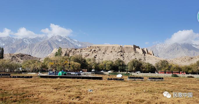 音乐节舞台设在金草滩上,石头城下,背靠兴都库什山,远眺慕士塔格峰,对面是喀喇昆仑山。正在紧张布置中