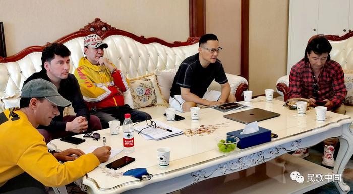 图:詹晓南(右二)与塔县音乐节组委会成员在研究演出节目