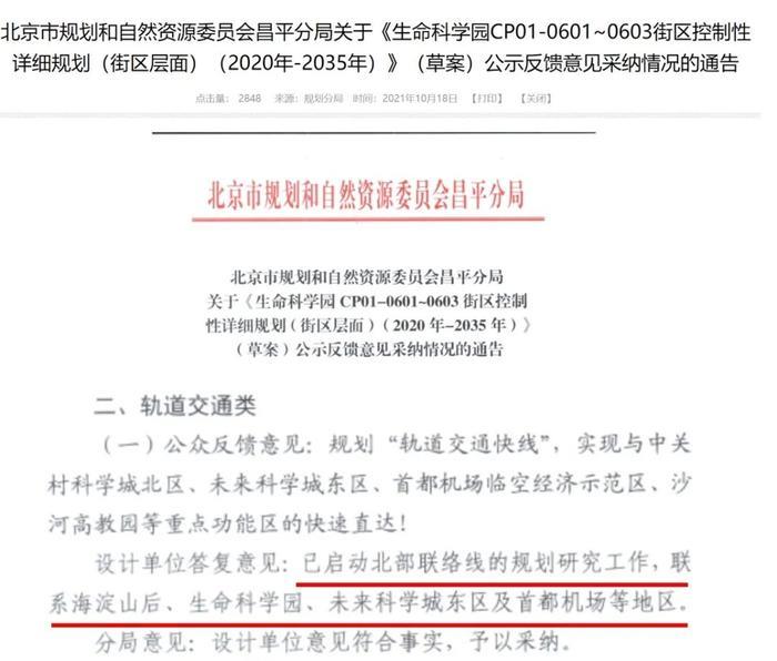 2021年12月公布的《北京市轨道交通线网规划(2020 年-2035 年)》草案中提到了北部联络线。