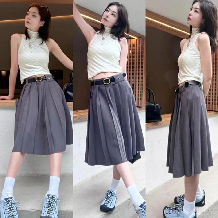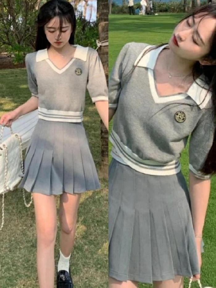 简单的Polo领设计的灰色短款上衣,随性休闲又带有满满的运动风的感觉。搭配短款的灰色百褶裙,同色系搭配简约高级,又显瘦显高。
