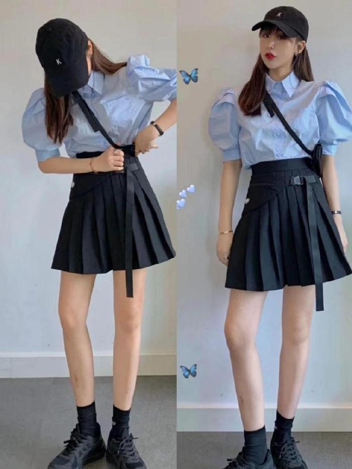 穿一件短袖款的蓝衬衫,清凉又舒适。冷感十足的颜色,在夏季看来也特别的舒爽。简单地搭配一条高腰款的黑色百褶短裙。