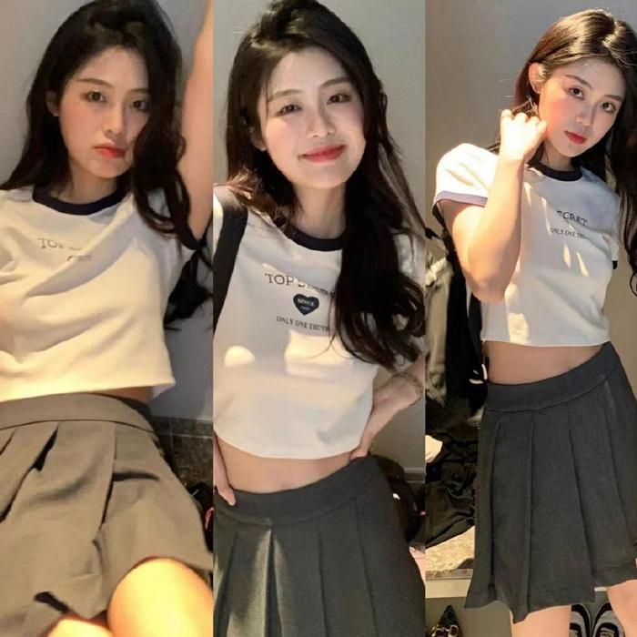 简单的“印花T恤+百褶裙”的组合,就是最清爽舒适的穿搭组合。穿一件短款的印花T恤,露出小蛮腰,活力感十足又有一点小性感。
