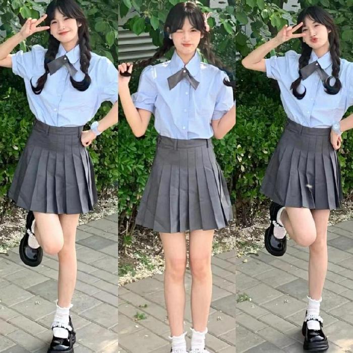 搭配一条灰色的百褶短裙,颜色和蝴蝶结颜色相同,整个色彩搭配就非常简约舒适。穿一双有光泽感的黑色皮鞋,这样一身清爽干净又有元气活力感的穿搭,就打造完成了。