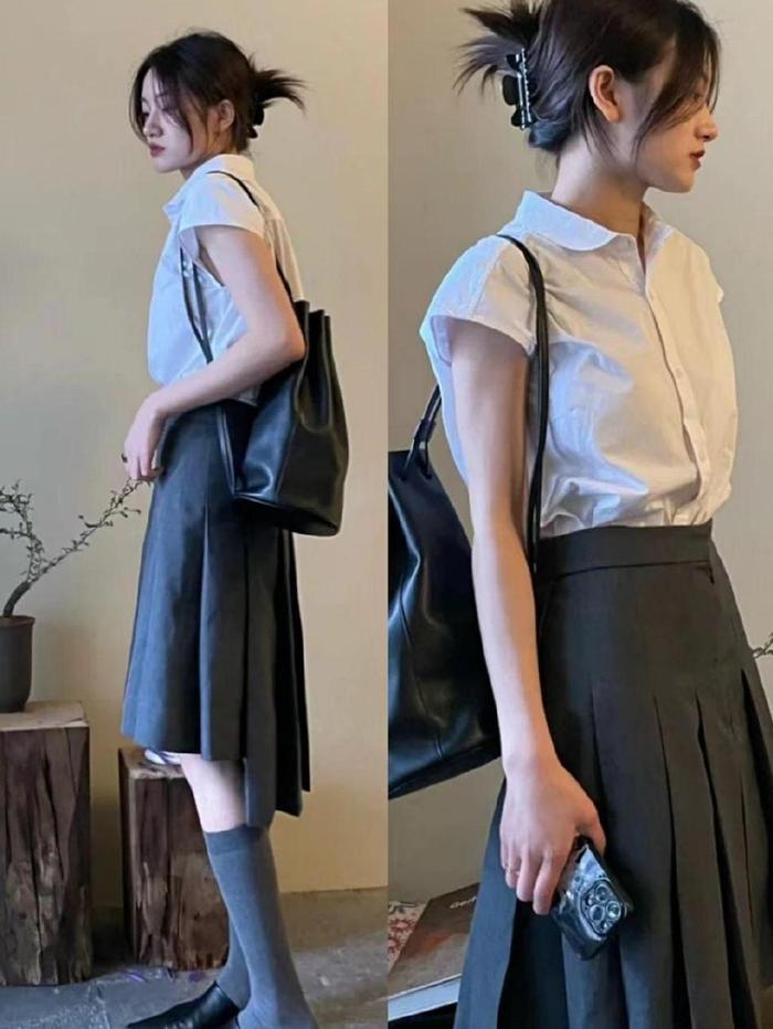 六月正是火热的毕业季,穿一身青春有活力的“学院风”穿搭,也是不错的选择。穿一件短袖款的蓝色衬衫,佩戴上一个灰色蝴蝶结,甜美乖巧又灵动可爱。