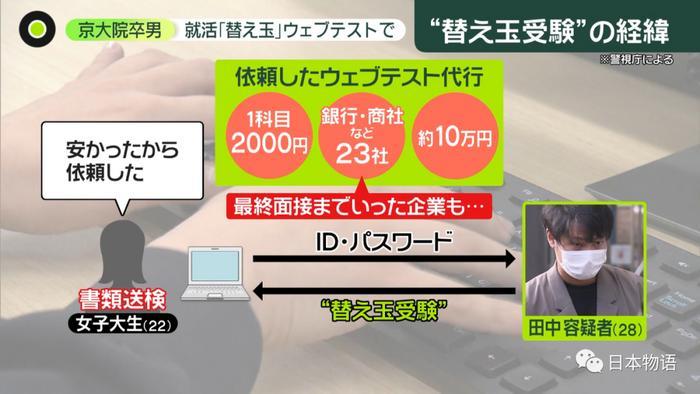 这其中有一名在东京念大学四年级的22岁女大学生,由于入职考试一直没有通过,因此今年4月花了10万日圆给田中信人,让对方代她参加总计23家公司的招聘考试。