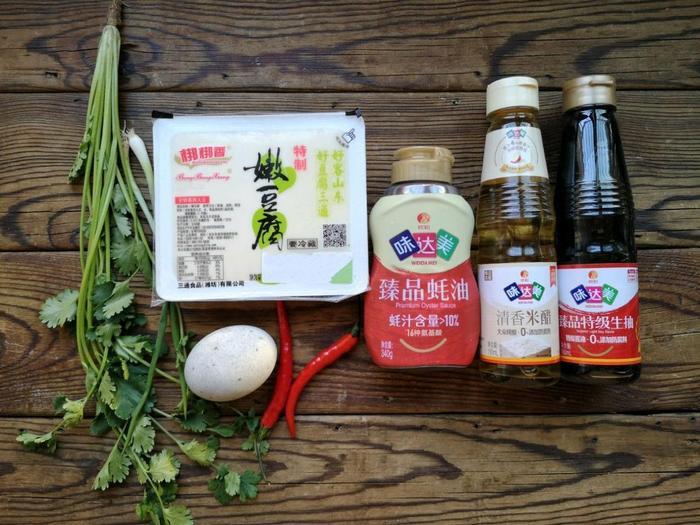【烹饪食材】:皮蛋一百克,大豆腐一百克,香菜五克,小米辣五克,小葱五克,生抽五克,白芝麻五克,蚝油五克,米醋两克,香油两克,盐一勺,白糖一勺